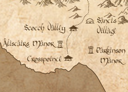 Crosspointe is the home of the Mage Alastair, who lives in his Manor House on the bluff overlooking the town. The Archmage Ajay lives to the south, at Parkinson Manor